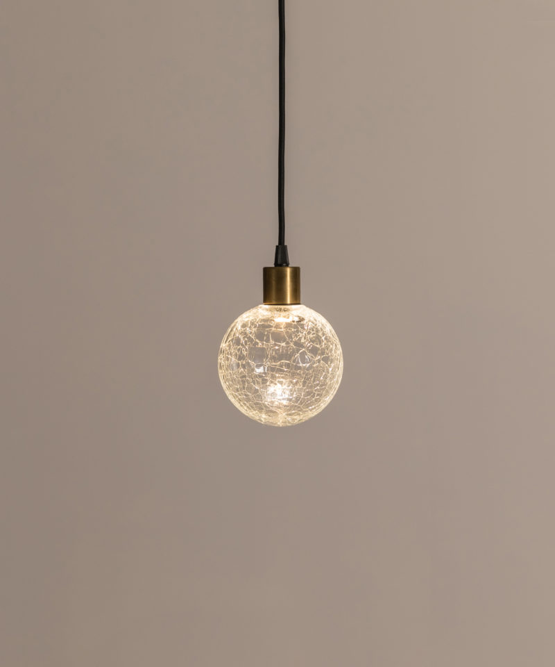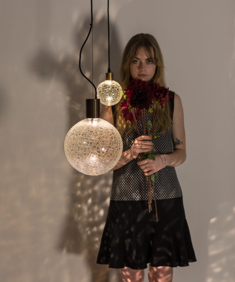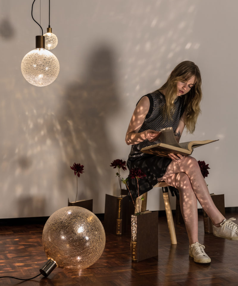The Eon Collection was designed to bring Richard Kelly’s three principles into a single light. The Eon pendants are made up of three physical parts which represented those principles. First, the metal piece which contains the light source as the “focal glow”. Second, the glazed orb as a diffuser to create “ambient luminescence”. Third, ADesignStudio’s unique crackle glass finish creates a natural dappled light refraction to add a “play of brilliance”.