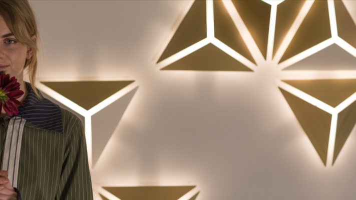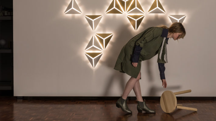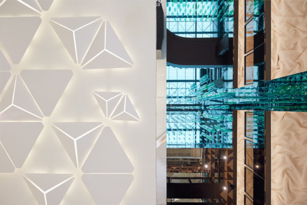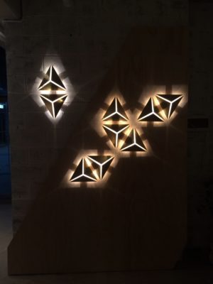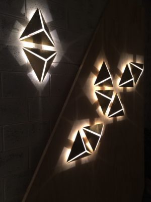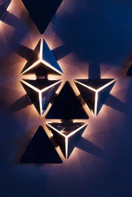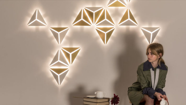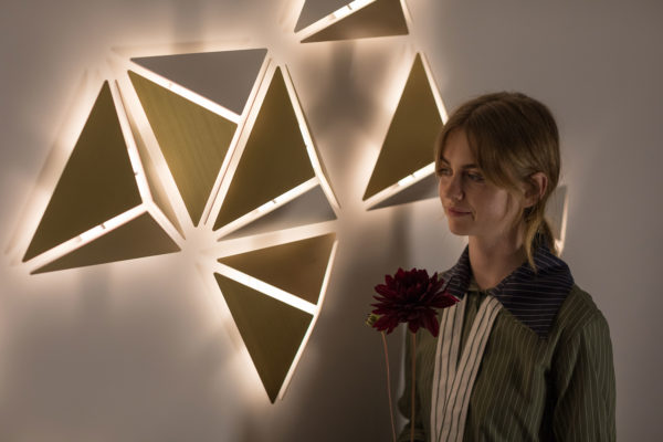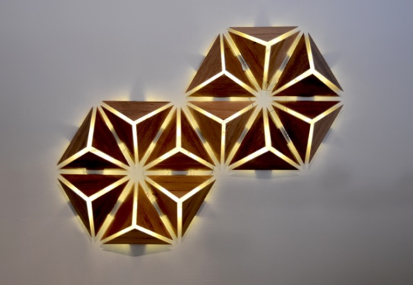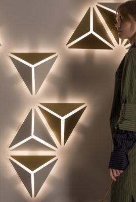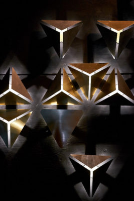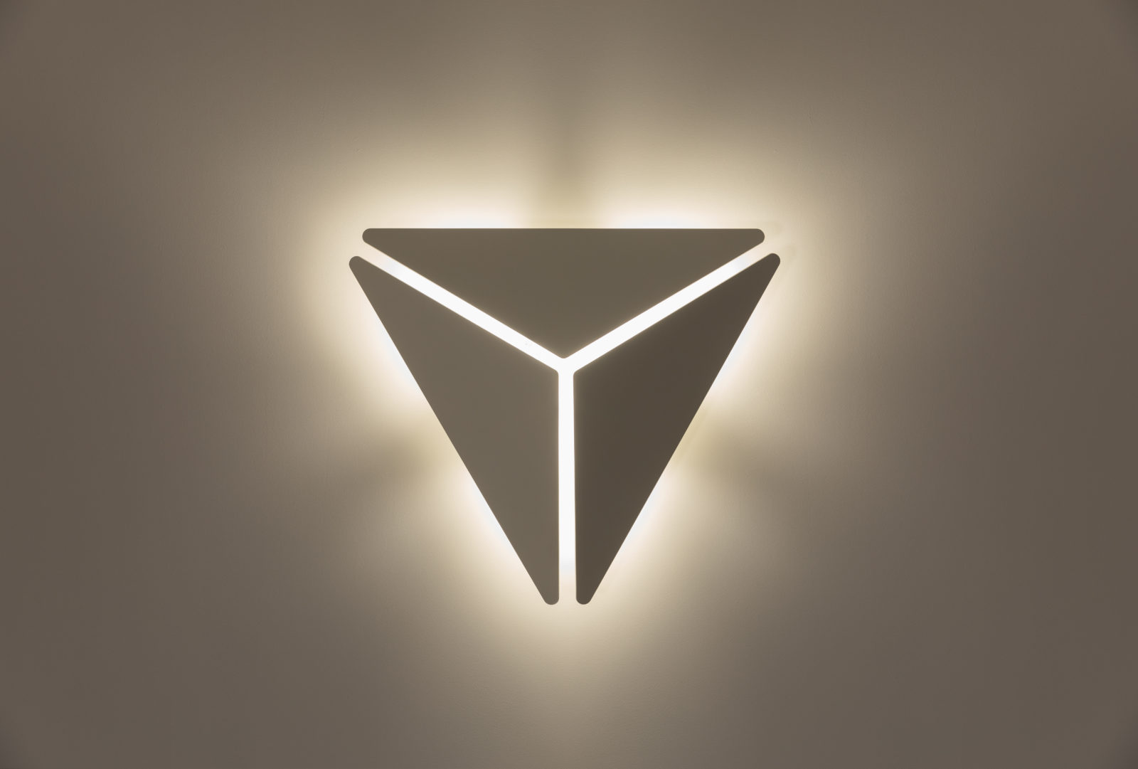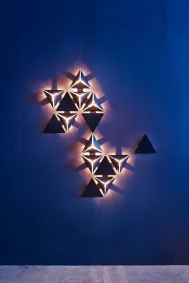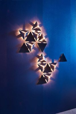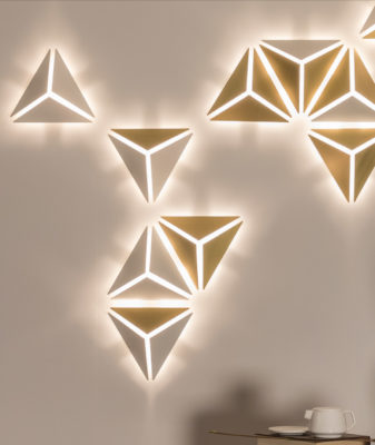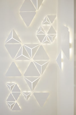 The Light Garden is designed to recreate the quality of varied, ambient light found in nature within an interior environment. The fittings use a series of triangular panels, in different sizes as a relief sculpture coming out from the wall. The light radiates from behind the panels.
