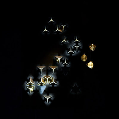 As is often seen in nature, the geometric system can fit together and grow into unlimited compositions which result in a naturalistic spread of light across any surface. The installation itself provides endless scale and opportunity for personalisation. The collection is often used as a single light fitting and is also installed across vast ceilings in commercial projects.