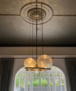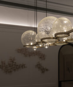 Our journey with crackle glass began at ADesignStudio, where our skilled glass blowers explored the idea of encapsulating light within a sphere without visible sources. This experimentation led to the creation of this beautiful lighting fixture.