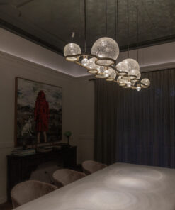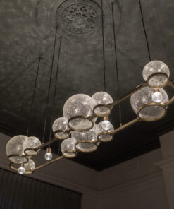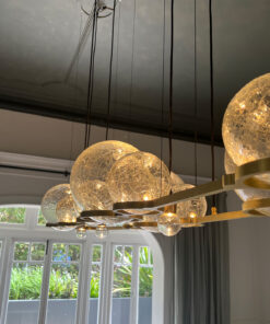 The Eon Chandelier captures the essence of blowing bubbles, a cherished moment especially for children. Our Crackle Eon spheres emulate the act of catching bubbles mid-flight. These spheres are arranged in an asymmetric cluster, with the crackle glass appearing to float effortlessly from the frame. Upon illumination, the dappled light creates a stunning visual effect on the ceiling, bringing the beauty of the natural world indoors.