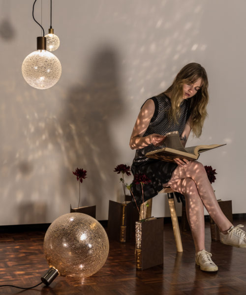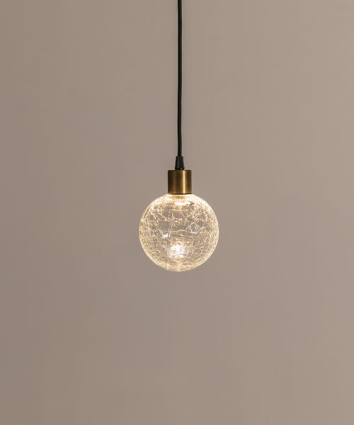 Suspended from above, the Eon Sans Collection perfectly captures the anatomy of light. The light source sits in a metal fitting that houses itself in an orb of ADesignStudio’s crackle glass. When illuminated, light refracts through the crackle glass, resulting in a dappled glow that projects shard-like visuals on nearby surfaces.