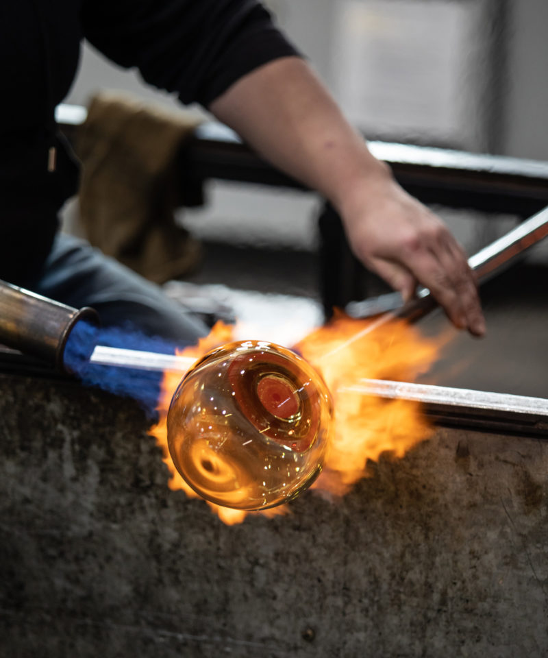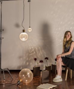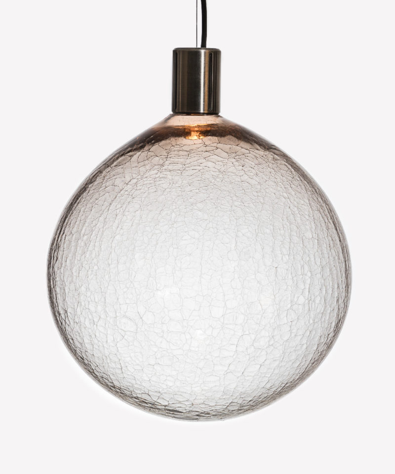 Suspended from above, the Eon Sans Collection perfectly captures the anatomy of light. The light source sits in a metal fitting that houses itself in an orb of ADesignStudio’s crackle glass. When illuminated, light refracts through the crackle glass, resulting in a dappled glow that projects shard-like visuals on nearby surfaces.