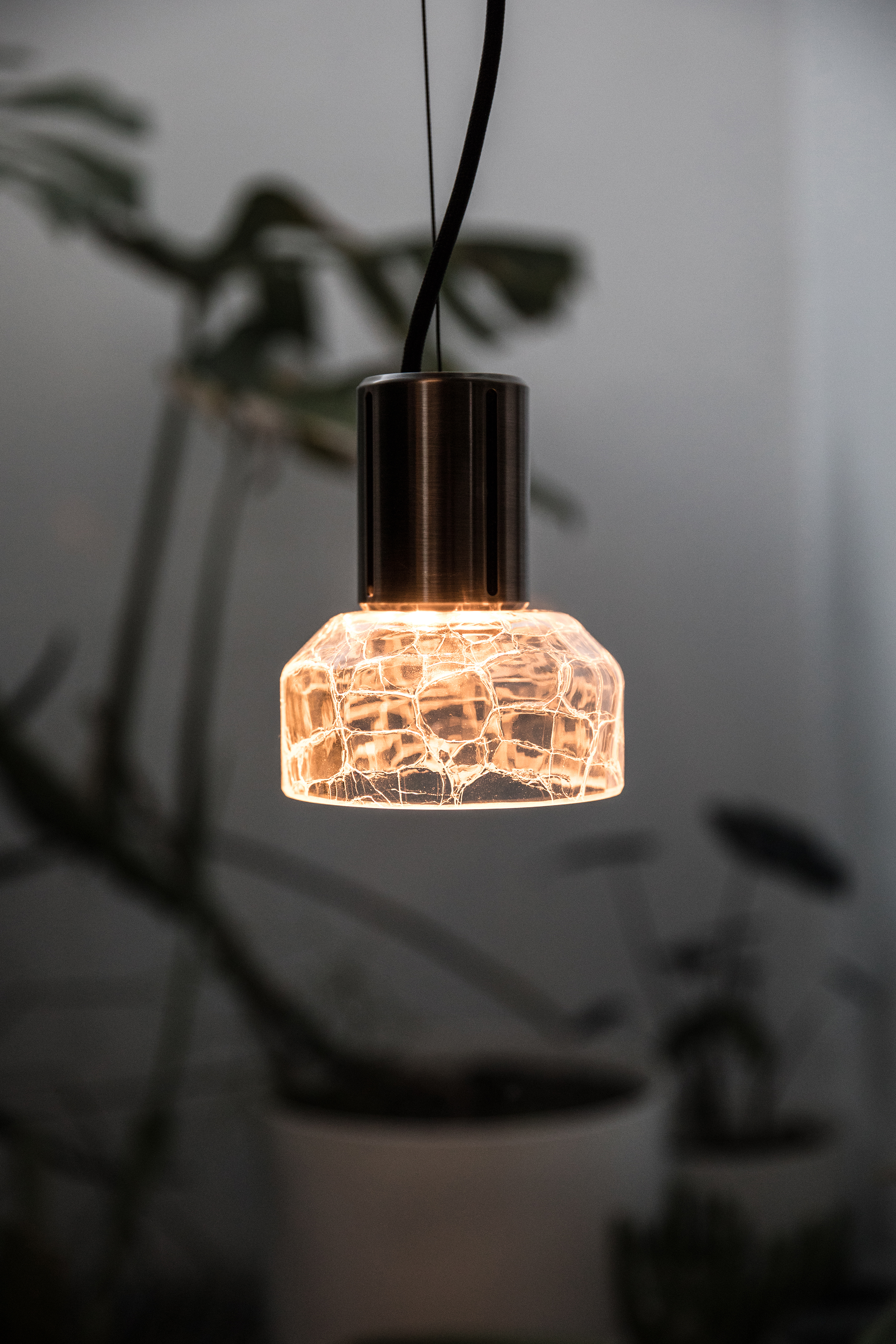 The Greenway lighting system is made from metal fitting which conceals the light source, a series of handblown glass made in ADesignStudio’s custom crackle glass finish. The light source is a concealed warm LED with dimmable control options.
