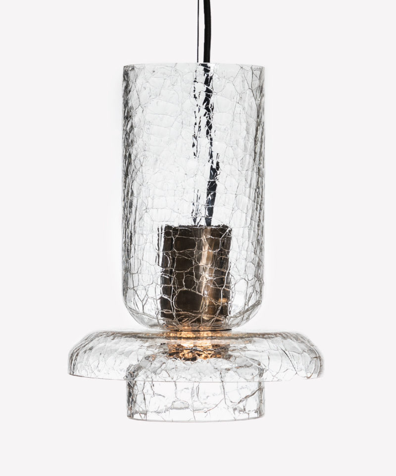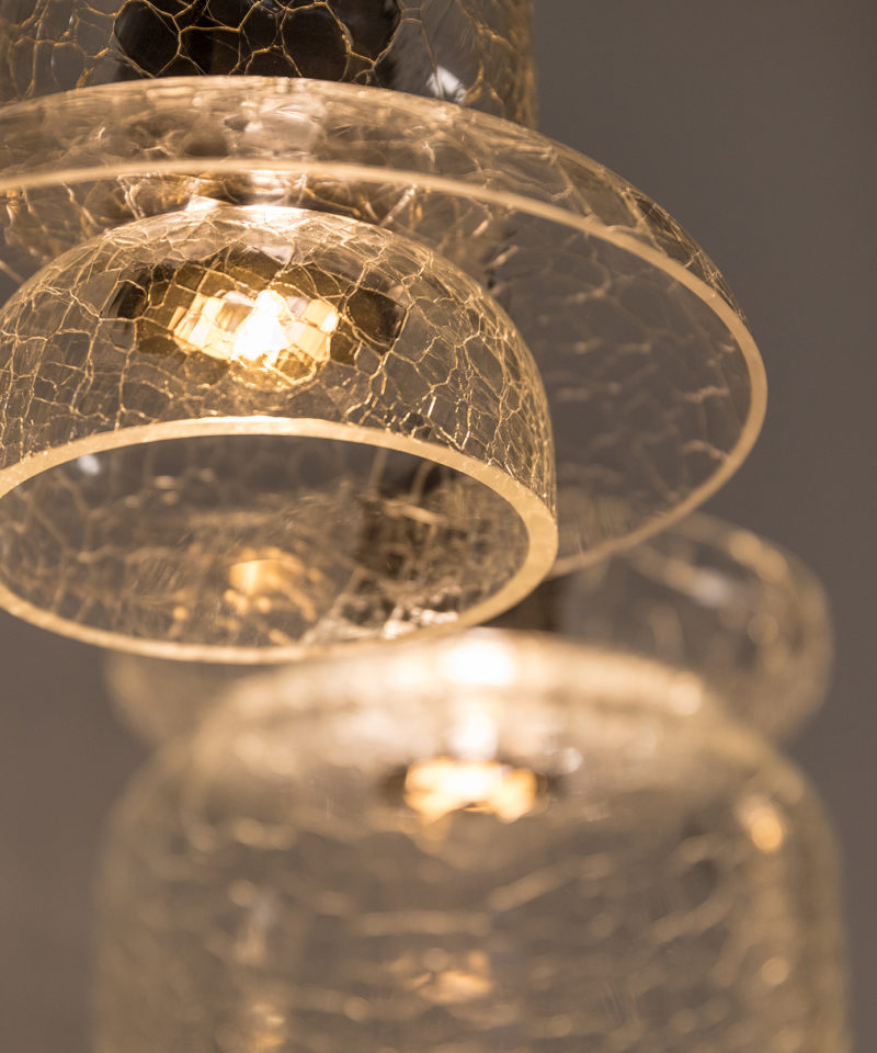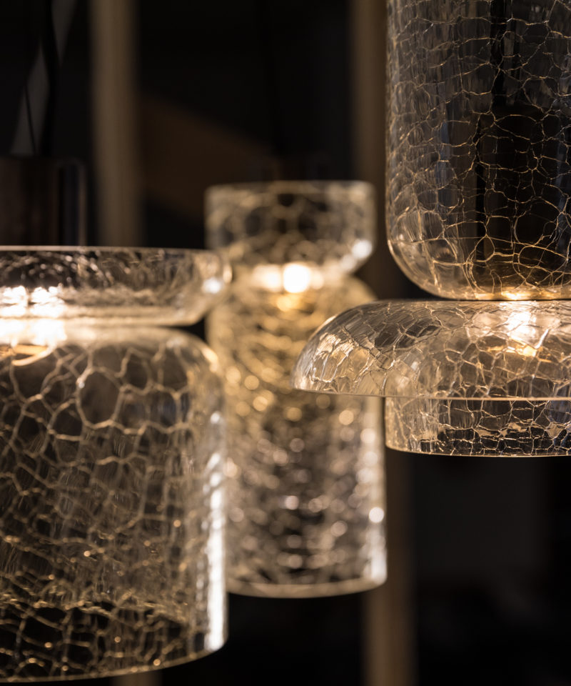 ADesignStudio’s Crackle collection sparks intrigue when hung from above. The design draws on Greenway’s system of lighting components referencing Australia’s historic maritime architecture. The outer glass has a crackle glass finish, which illuminates when lit. The metal fitting helps to conceal the internal light source, illuminating the space or table below.
