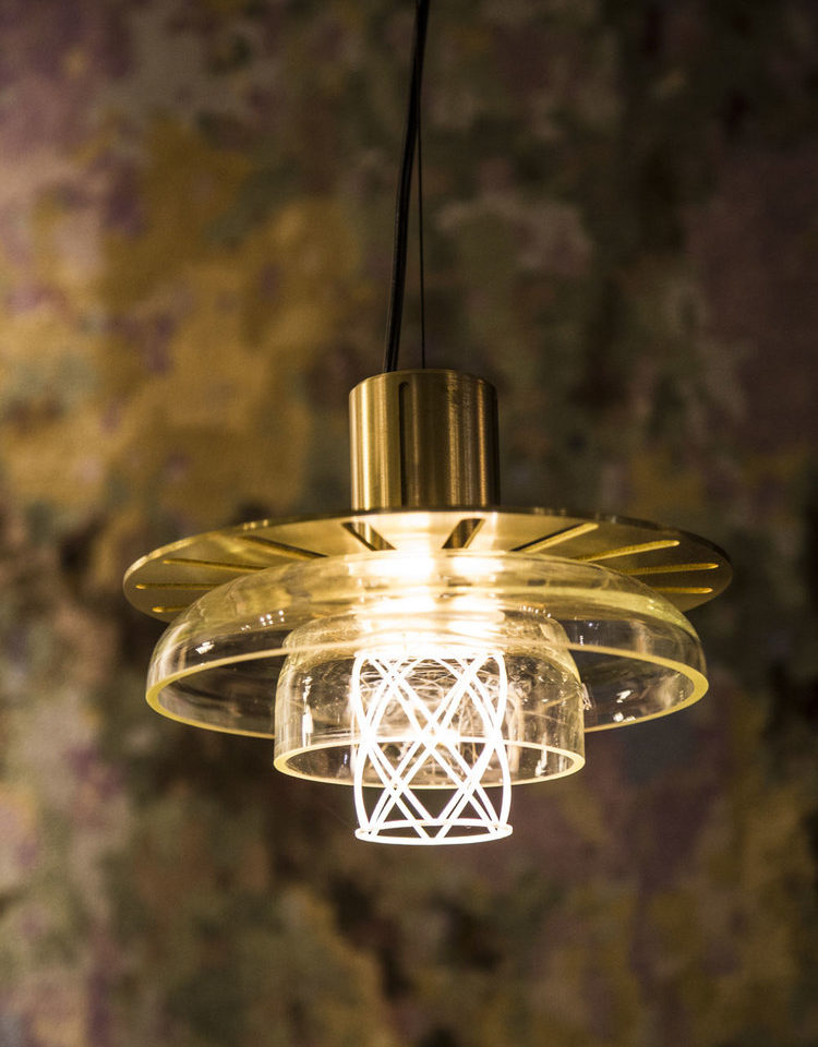 The Greenway lighting system is made from metal fitting which conceals the light source, a metal disk, a series of handblown glass forms which diffuse the light akin to the “lantern room”, and a 3D printed, perforated lattice. The light source is a concealed warm LED with dimmable control options.