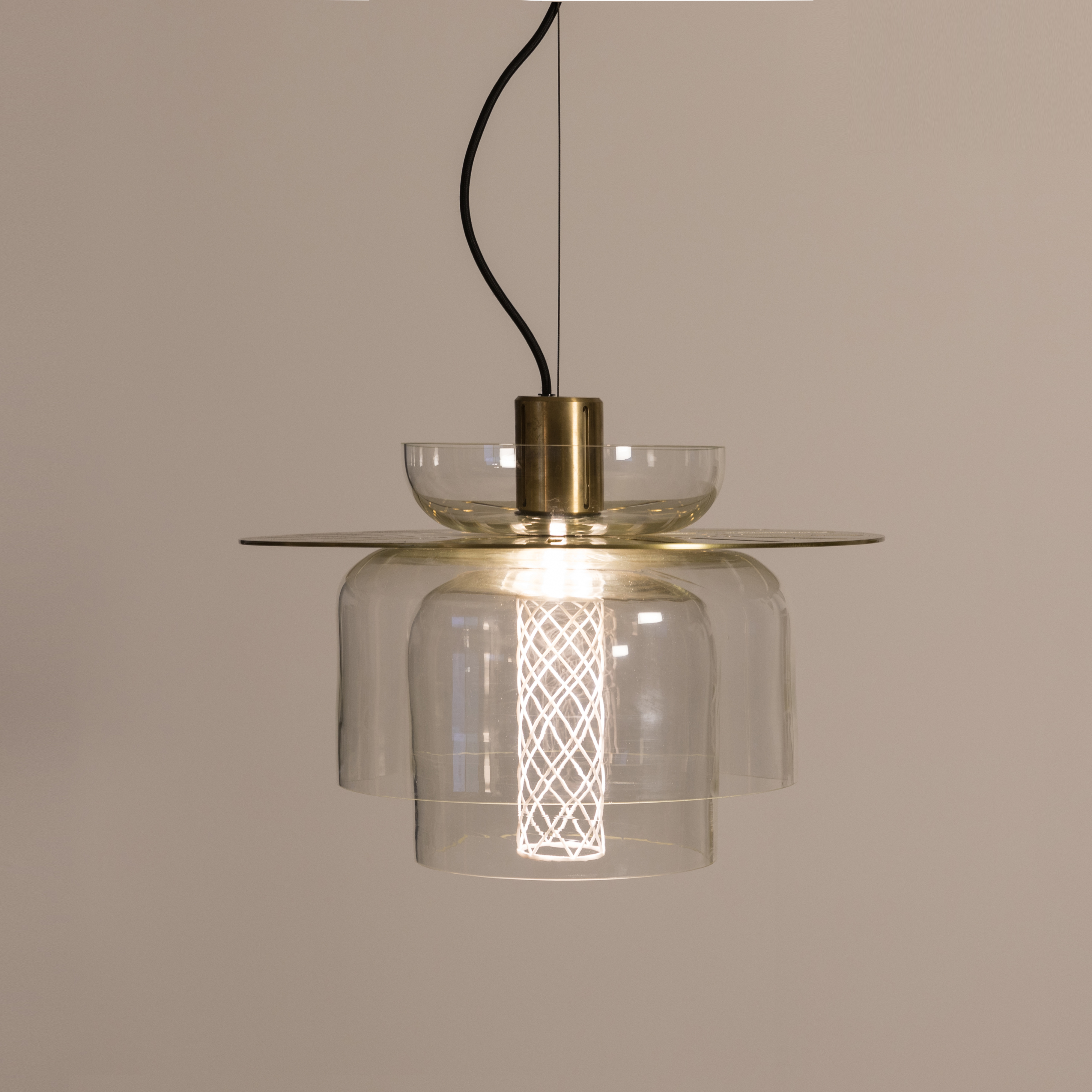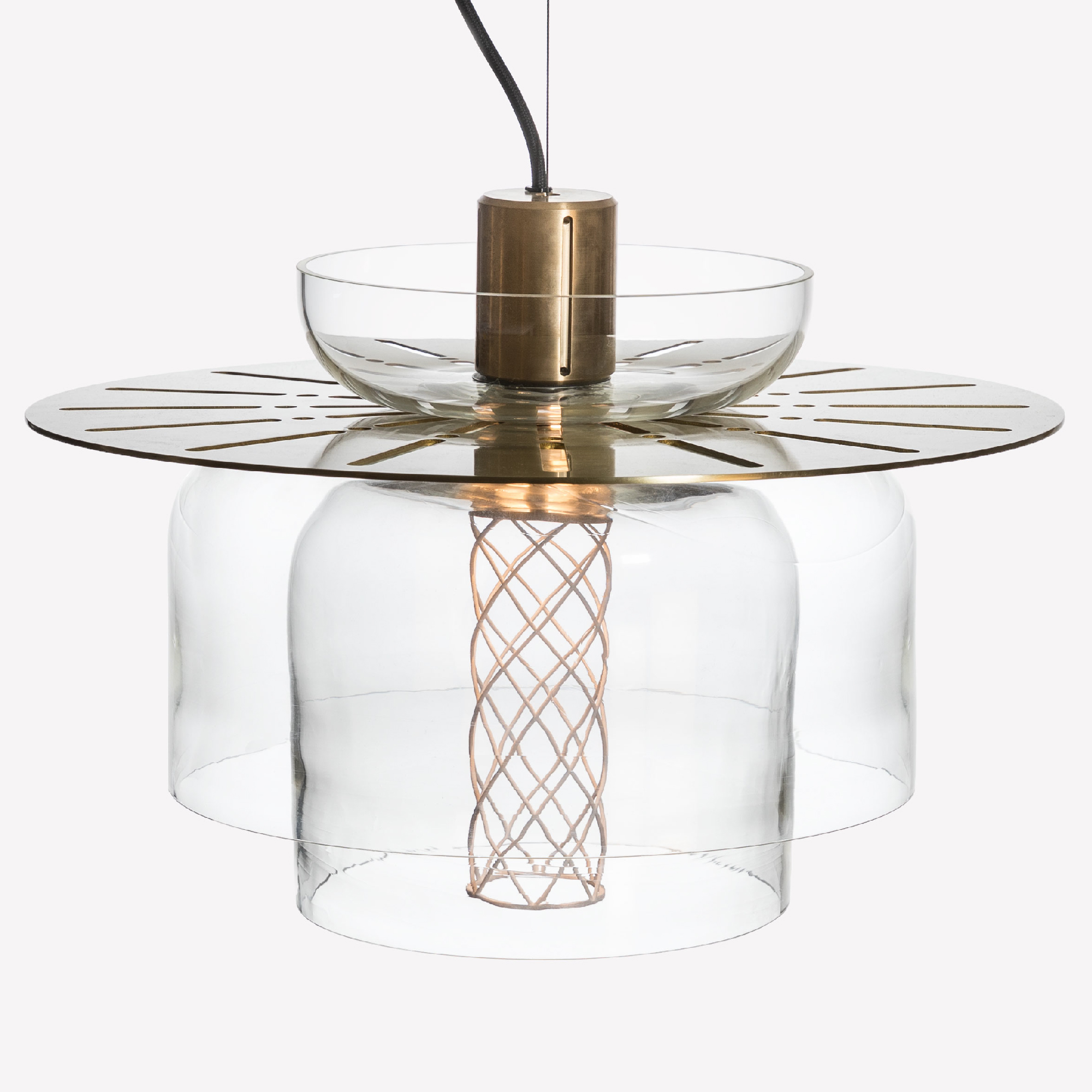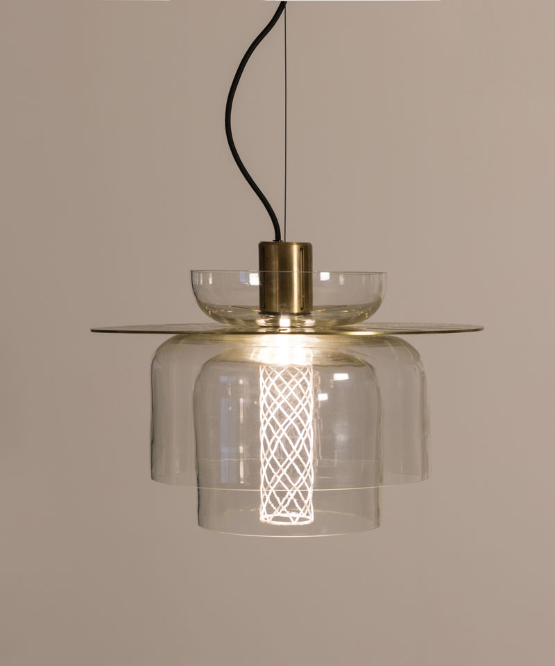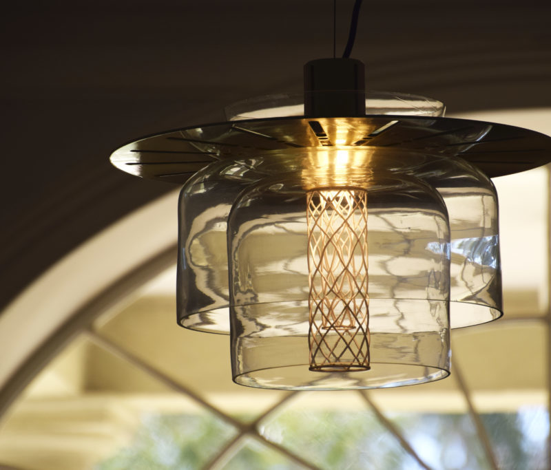 The Greenway lighting system is made from metal fitting which conceals the light source, a metal disk, a series of handblown glass forms which diffuse the light akin to the “lantern room”, and a 3D printed, perforated lattice. The light source is a concealed warm LED with dimmable control options.